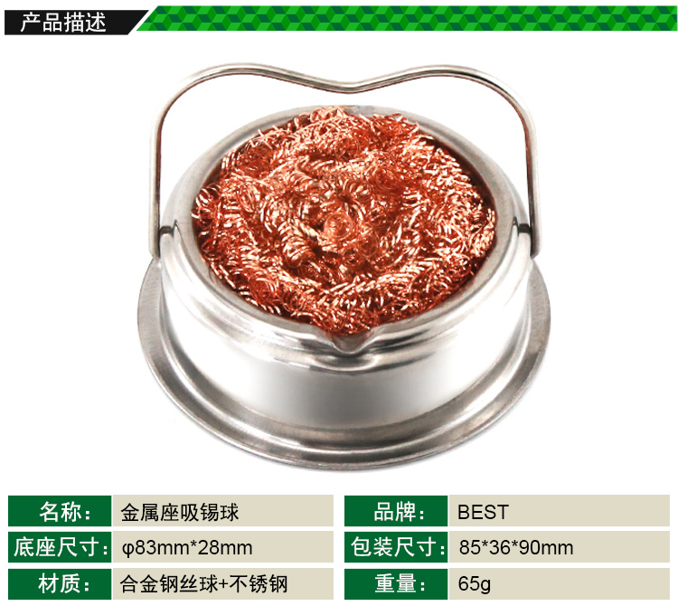 ? 产品名称: 金属座吸锡球 烙铁头清洁座? 产品品牌: BEST? 产品类别: 吸锡器系列