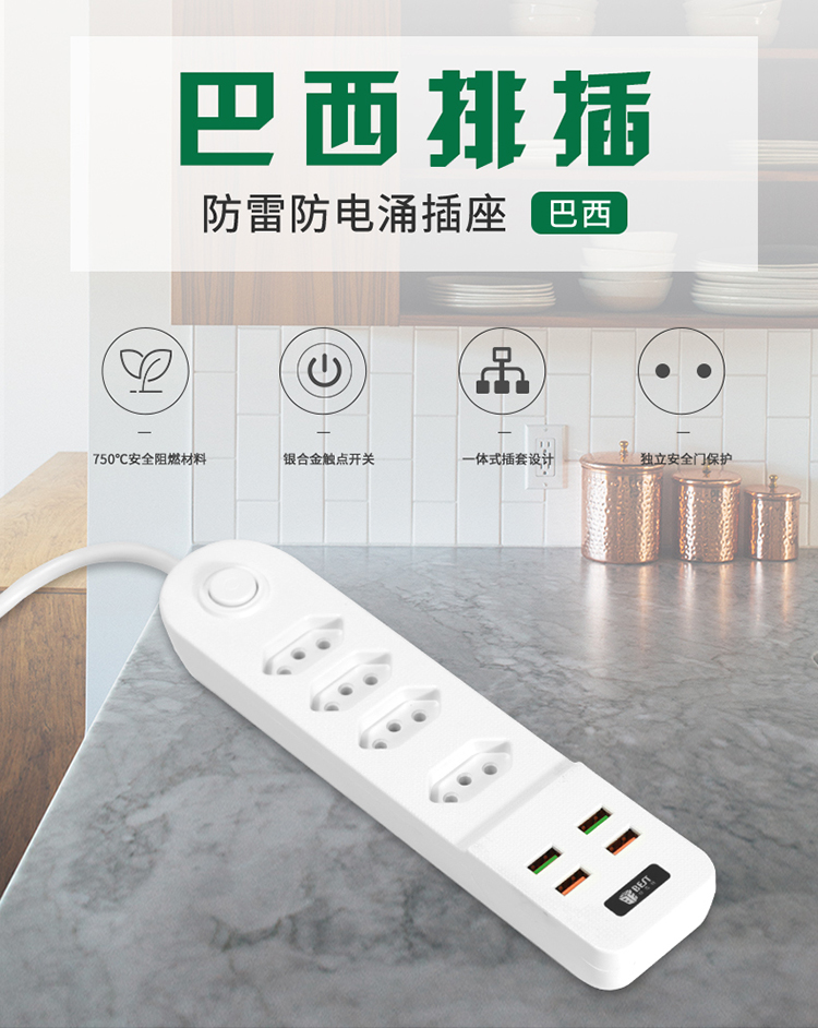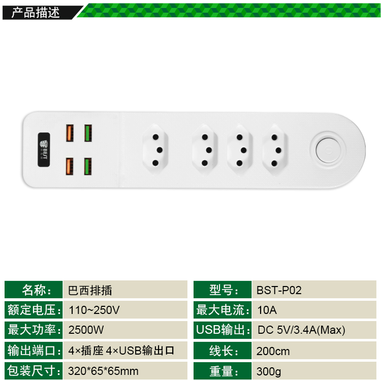 ? 产品名称: 巴西排插? 产品型号: BST-P02? 产品类别: 插座系列