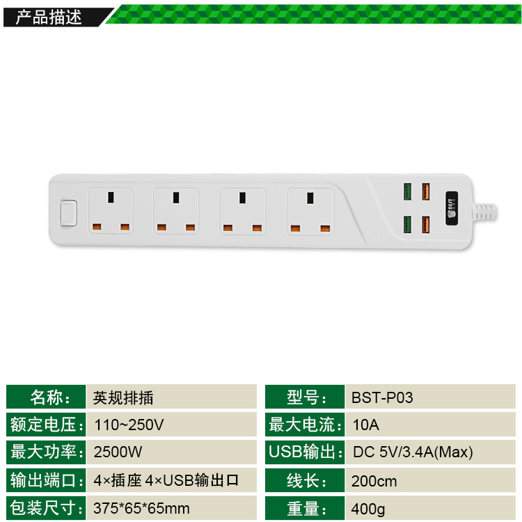 ? 产品名称: 英规排插? 产品型号: BST-P03? 产品类别: 插座系列