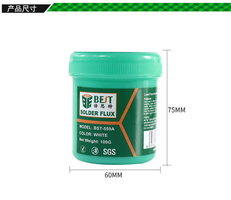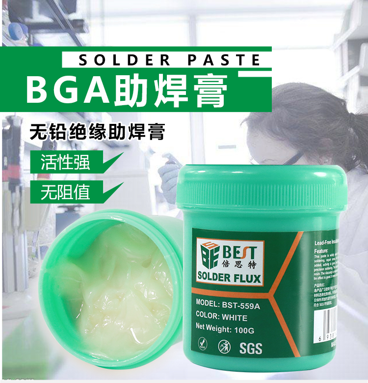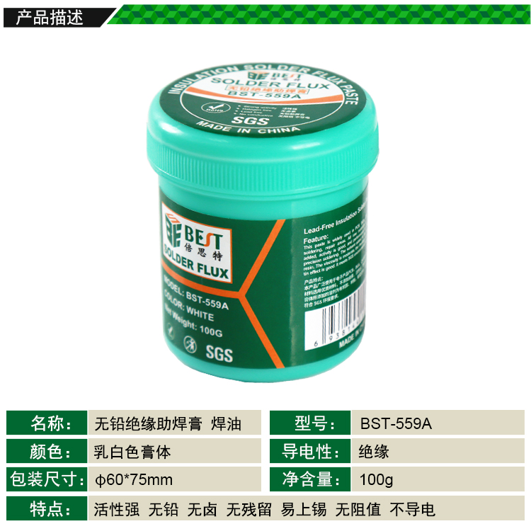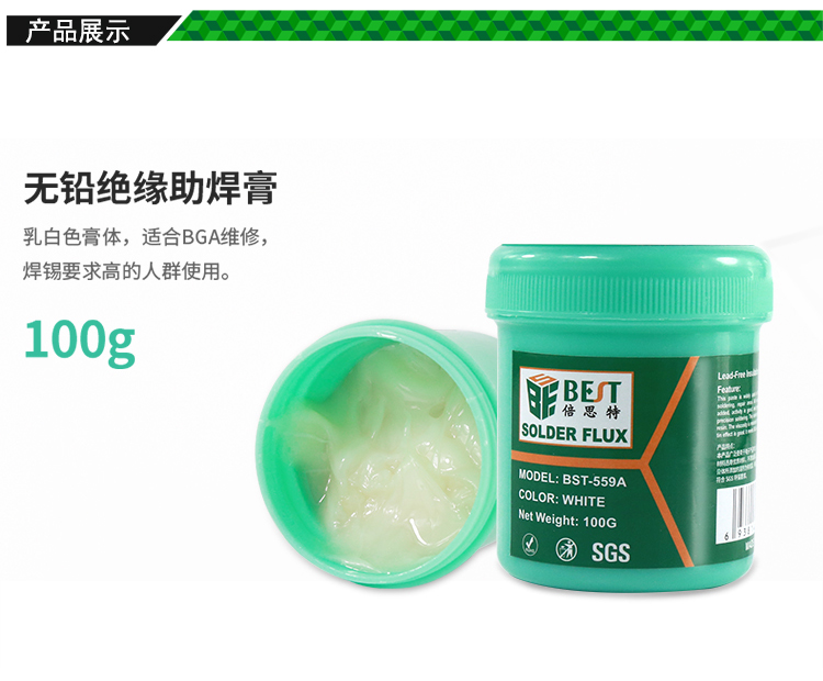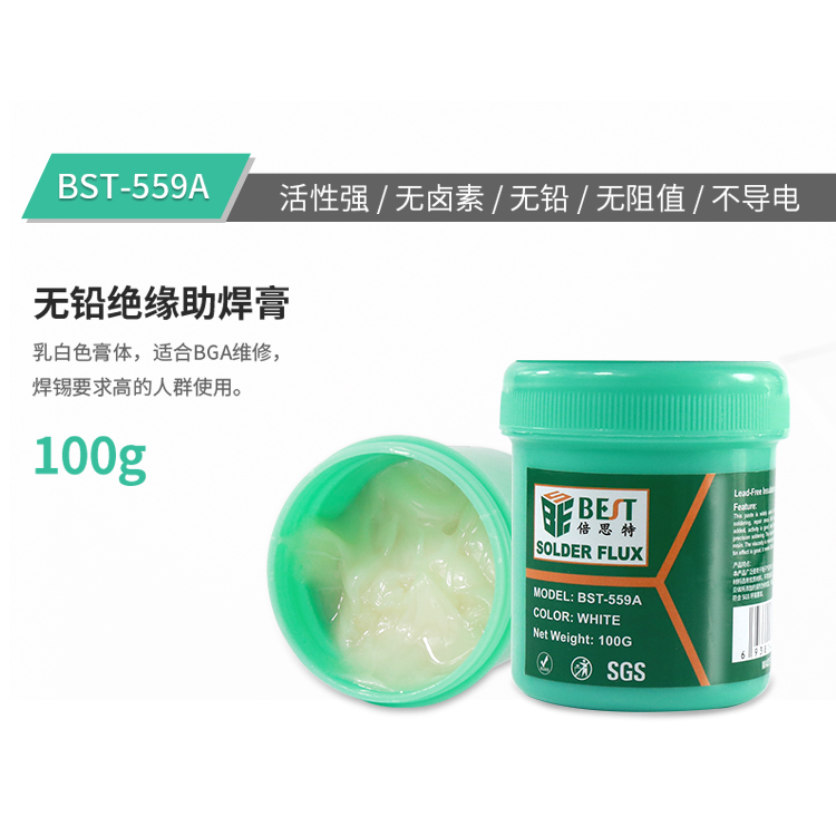 ? 产品名称: 无铅绝缘助焊膏? 产品型号: BST-559A? 产品类别: 锡浆焊油系列? 净含量: 100g
