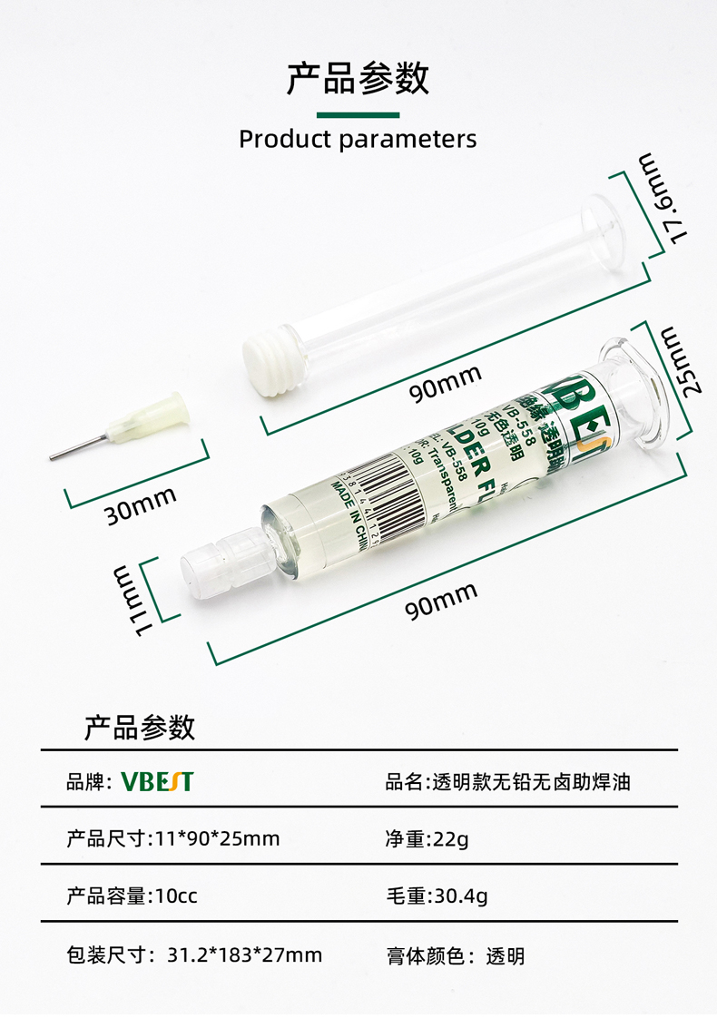 ? 产品名称: 环保绝缘透明助焊膏? 产品型号: VB-558? 产品类别: 锡浆焊油系列? 净含量: 10g