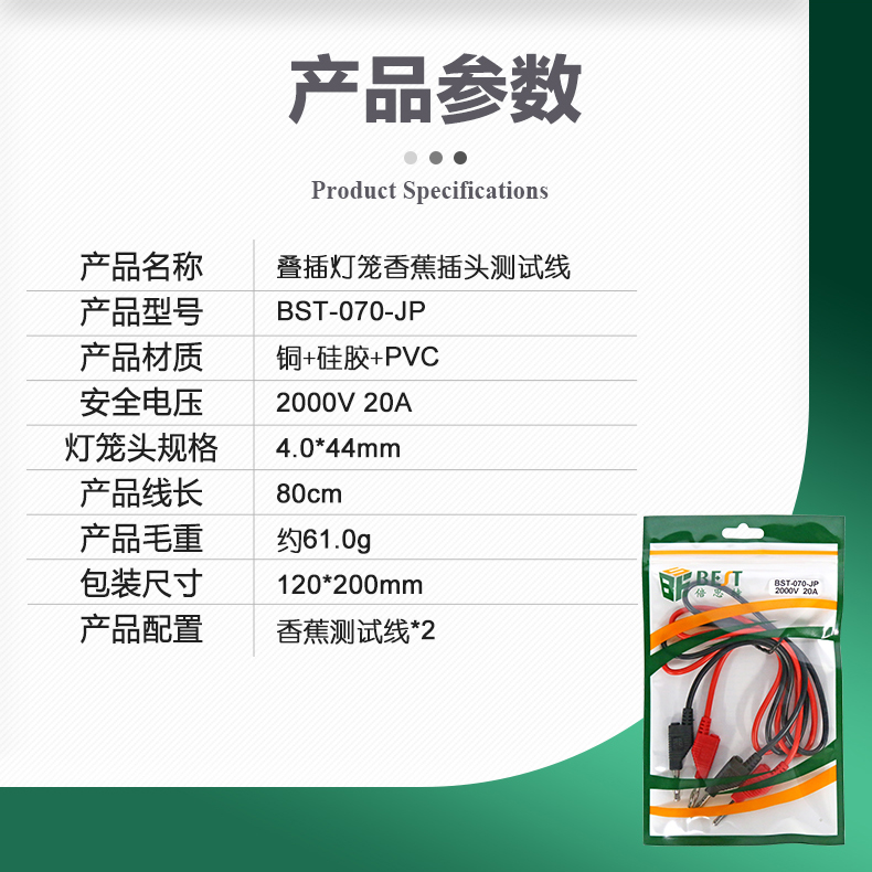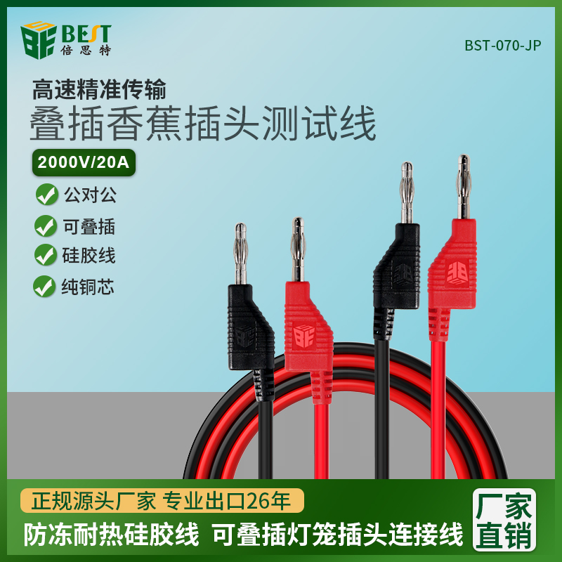 ? 产品名称: 叠插香蕉插头测试线? 产品型号: BST-070-JP? 产品类别: 表笔线系列