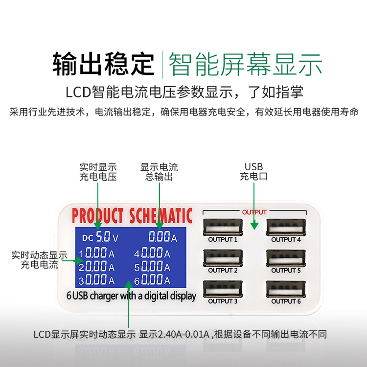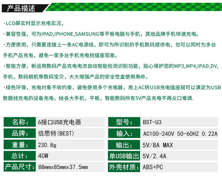 ? 产品名称: 6接口USB智能充电器? 产品型号: BST-U3? 产品类别: 综合类系列