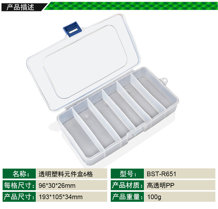 ? 产品名称: 6格透明塑料元件盒? 产品型号: BST-R651? 产品类别: 元件盒系列
