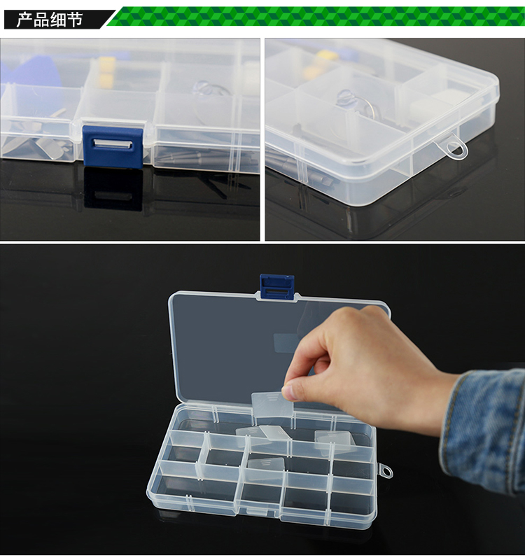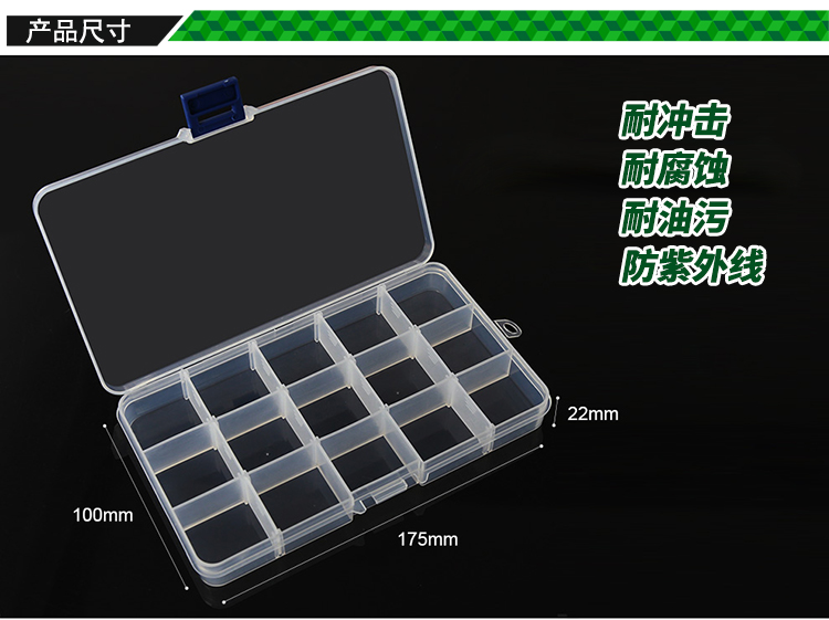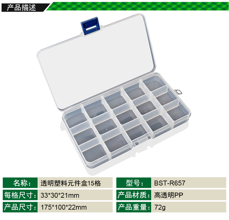 ? 产品名称: 15格透明塑料元件盒? 产品型号: BST-R657? 产品类别: 元件盒系列