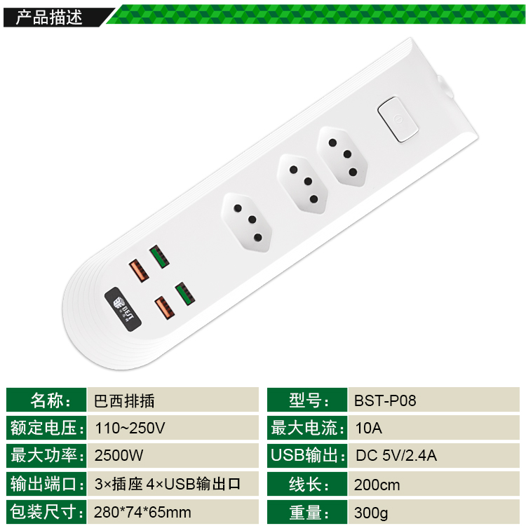 ? 产品名称: 巴西排插? 产品型号: BST-P08? 产品类别: 插座系列