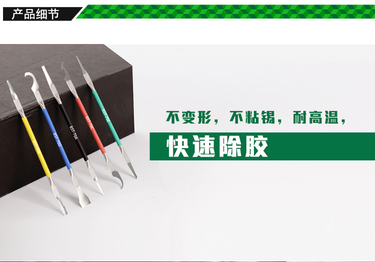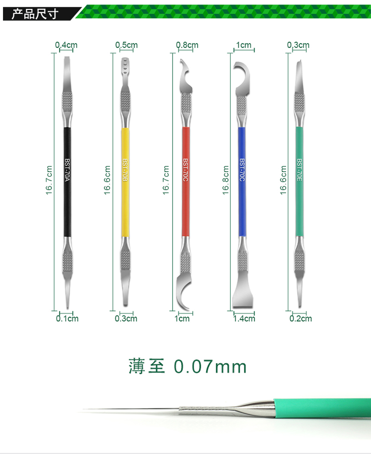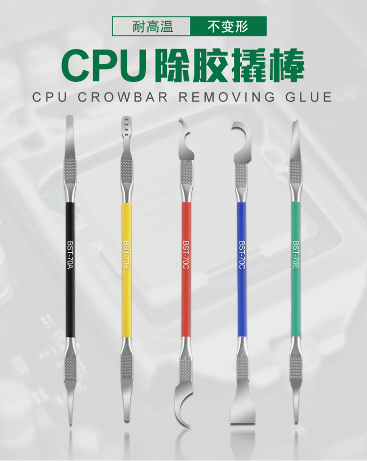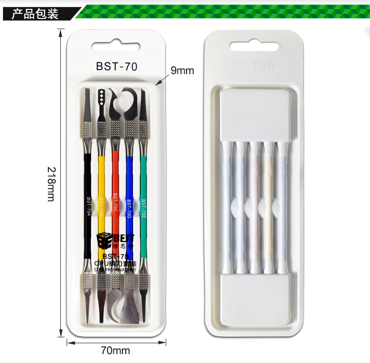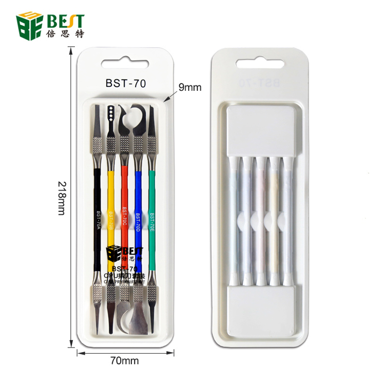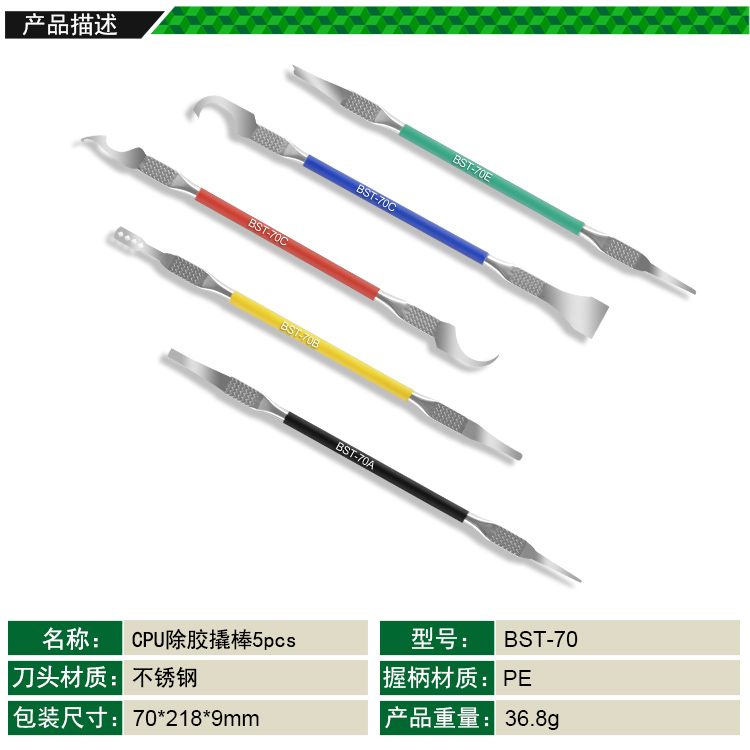 ? 产品名称: CPU除胶撬棒 芯片返修撬刀刻刀5pcs? 产品型号: BST-70? 产品类别: 刀具系列
