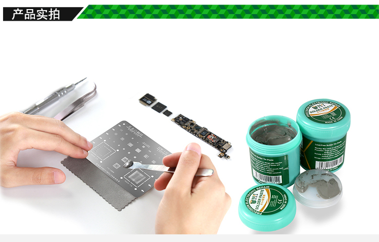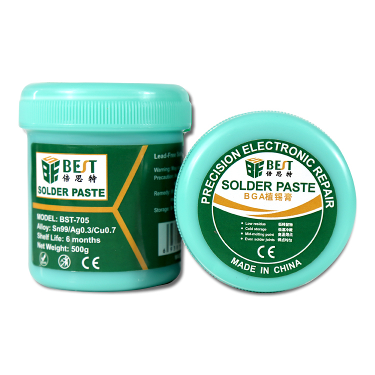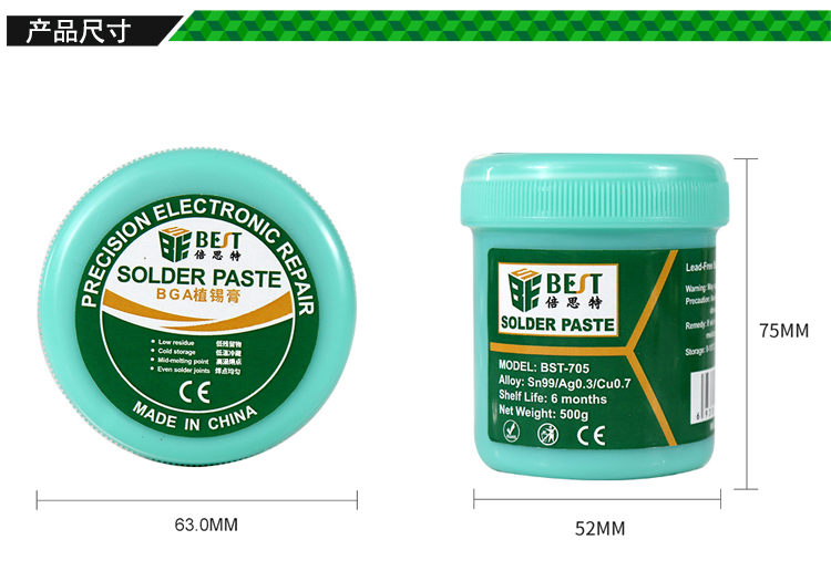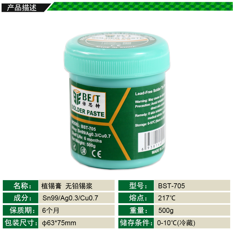 ? 产品名称: 无铅锡浆 焊锡膏 BGA植锡膏 500g? 产品型号: BST-705? 产品类别: 锡浆焊油系列? 产品成分: Sn99/Ag0.3/Cu0.7? 产品重量: 500g