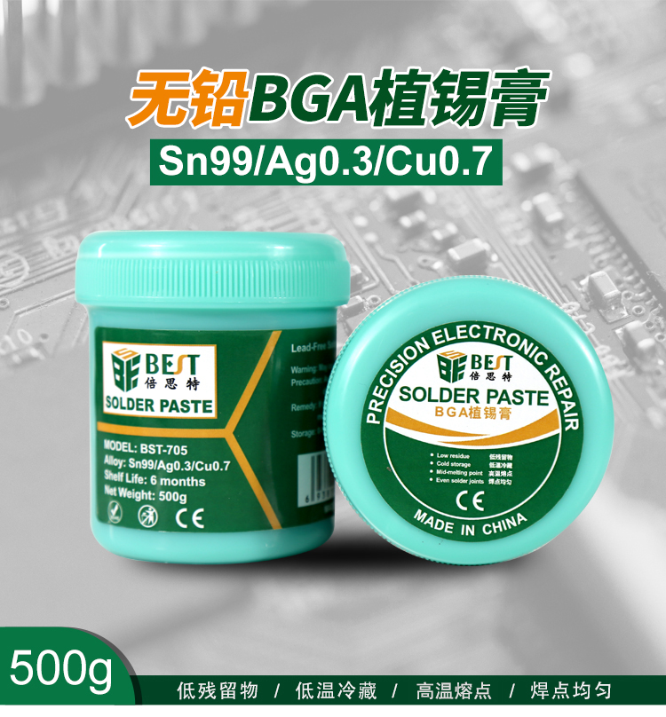 返回当前位置: 首页 / 产品中心 / BST-705 无铅锡浆 高温锡浆 焊锡膏 BGA植锡膏 Sn99/Cu0.7/Ag0.3 500g