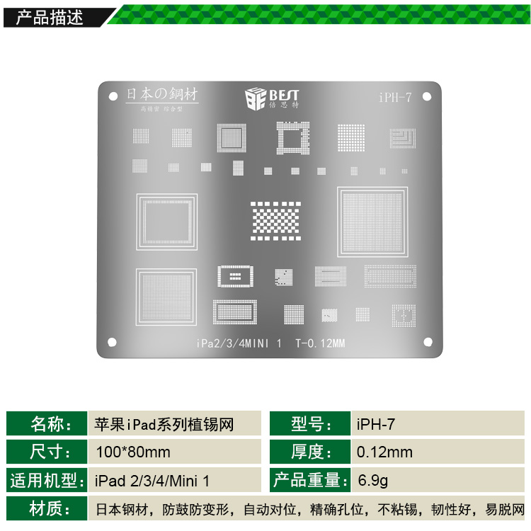 ? 产品名称: iPad 2/3/4/Mini 1专用植锡网? 产品型号: iPH-7? 产品类别: 植锡网系列