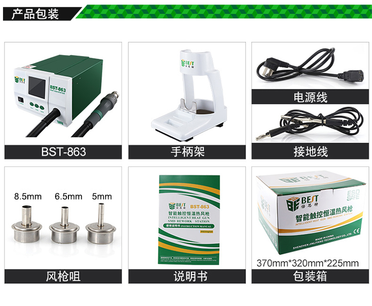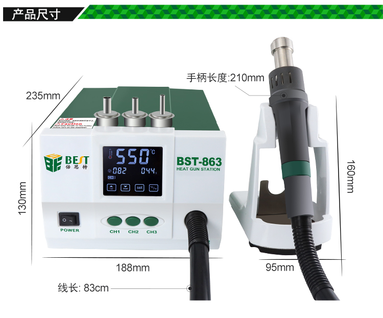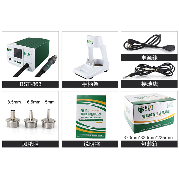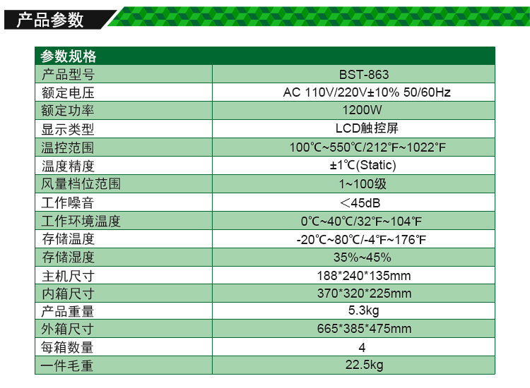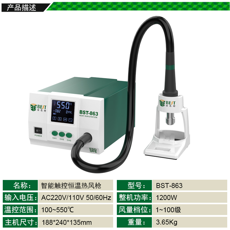 ? 产品名称: 智能数显触控恒温热风枪? 产品型号: BST-863? 产品类别: 热风枪系列? 额定电压: AC220V/110V 50/60Hz? 总机功率: 1200W? 工作环境: 0~40℃ 相对湿度<80%? 储存环境: -20~80℃ 相对湿度35~45%? 温度范围: 100℃~550℃? 风量档位: 1-100级? 工作噪音: <45dB? 包装尺寸: 370*320*225mm? 产品重量: 3.65kg