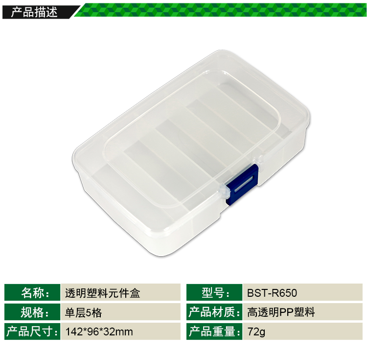 ? 产品名称: 5格透明塑料元件盒? 产品型号: BST-R650? 产品类别: 元件盒系列
