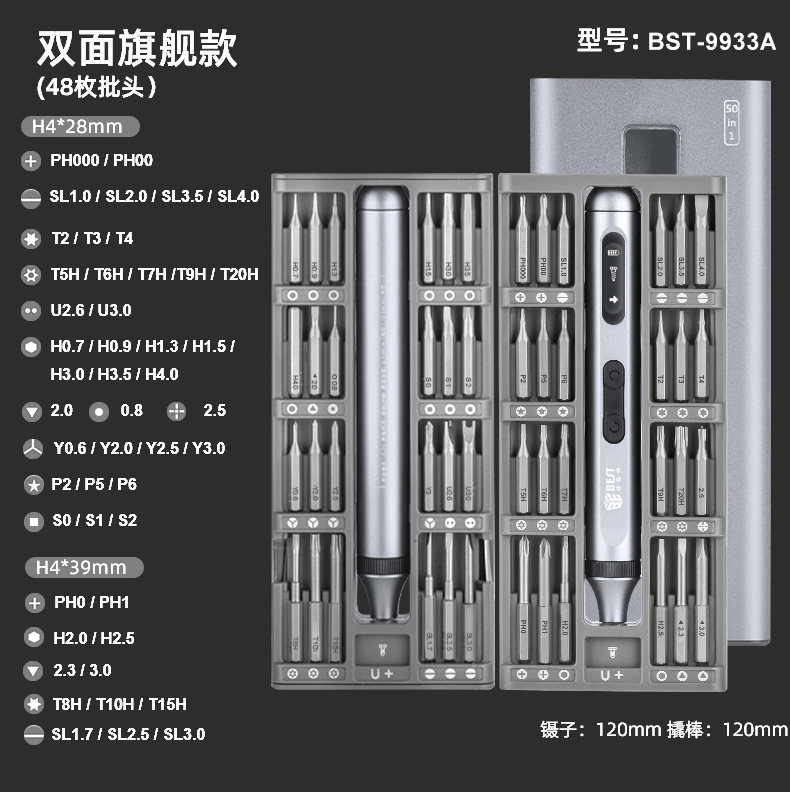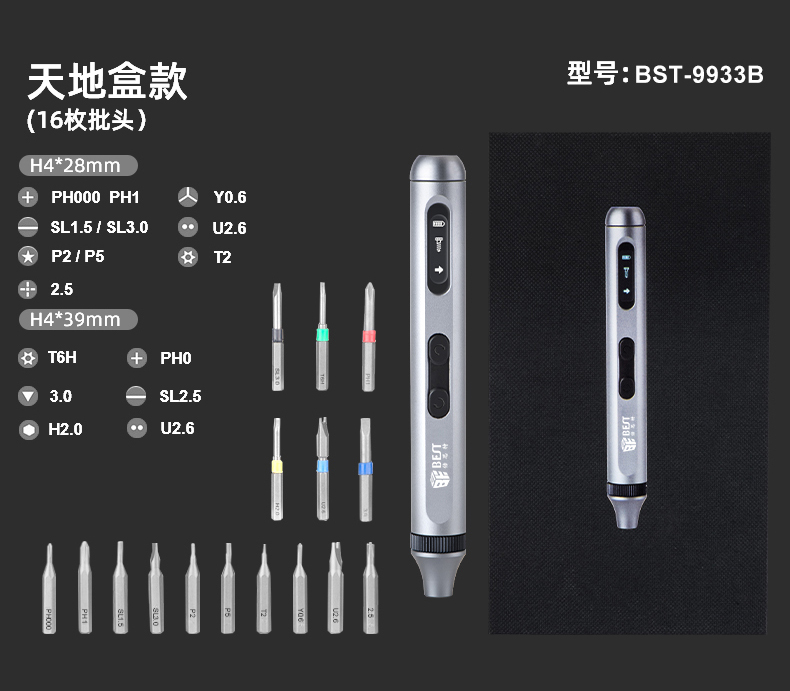 ? 产品名称: 电动精修螺丝刀套装? 产品型号: BST-9933A? 产品类别: 电动螺丝刀系列