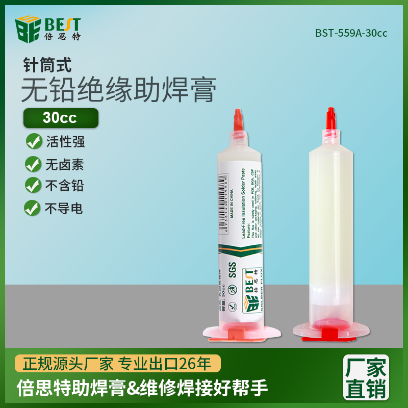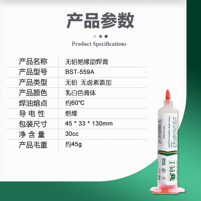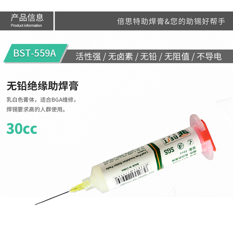 ? 产品名称: 无铅绝缘助焊膏? 产品型号: BST-559A? 产品类别: 锡浆焊油系列? 净含量: 30cc