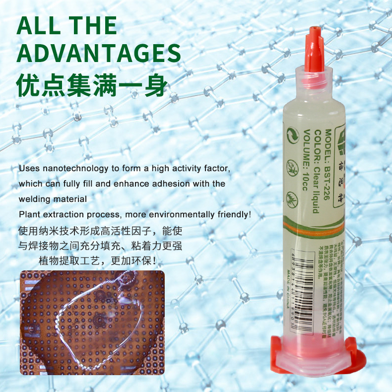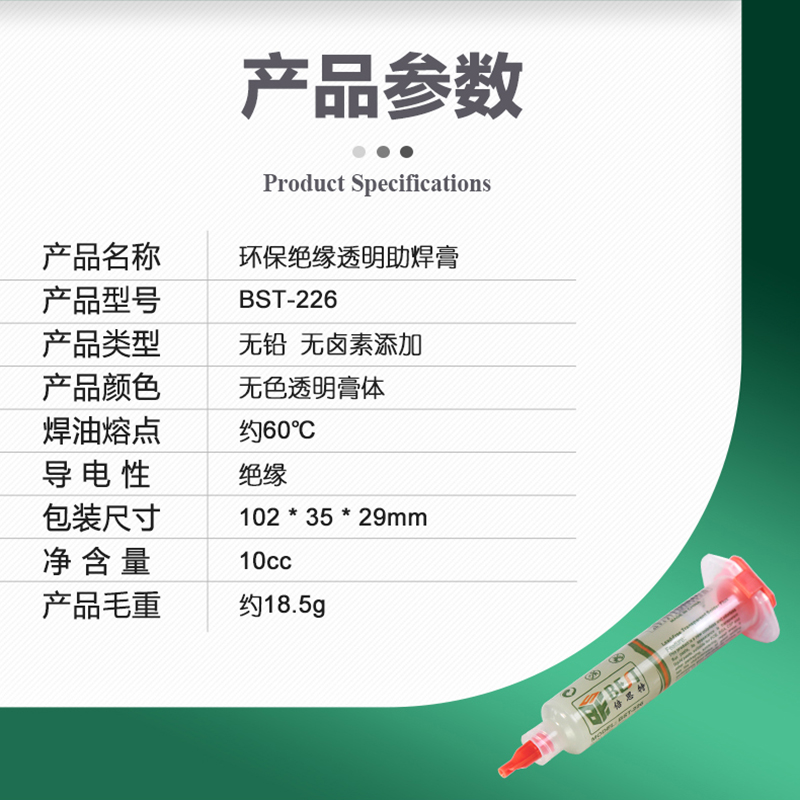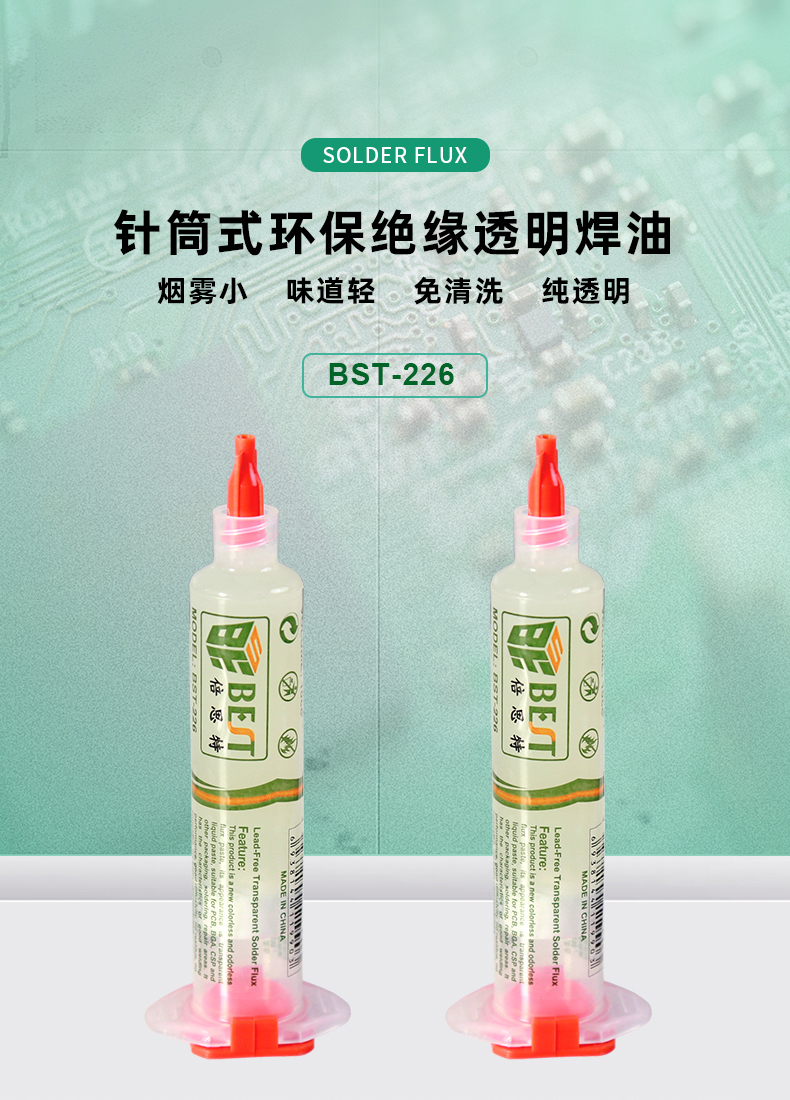 ? 产品名称: 环保绝缘透明助焊膏? 产品型号: BST-226? 产品类别: 锡浆焊油系列? 净含量: 10cc
