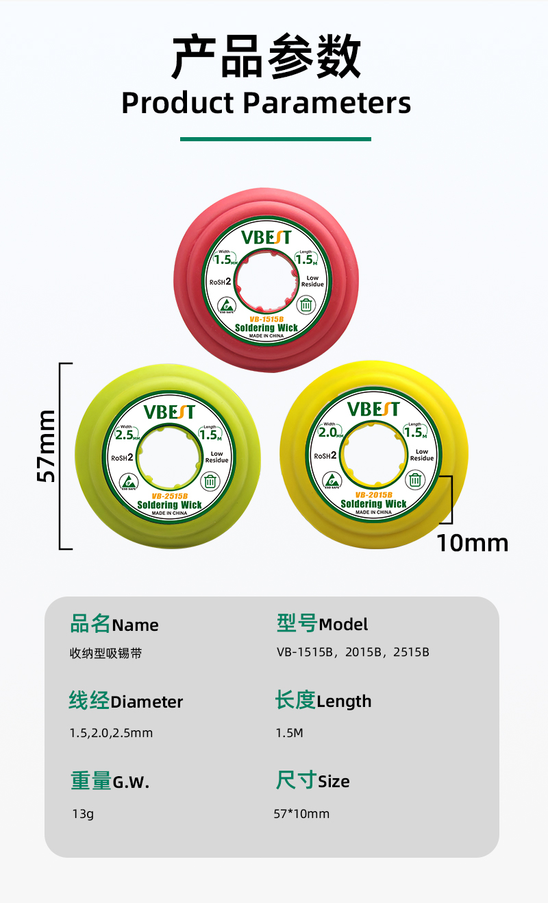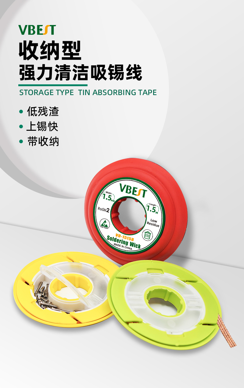 ? 产品名称: 收纳型吸锡带? 产品型号: VB-1515B/2015B/2515B? 产品类别: 吸锡线系列