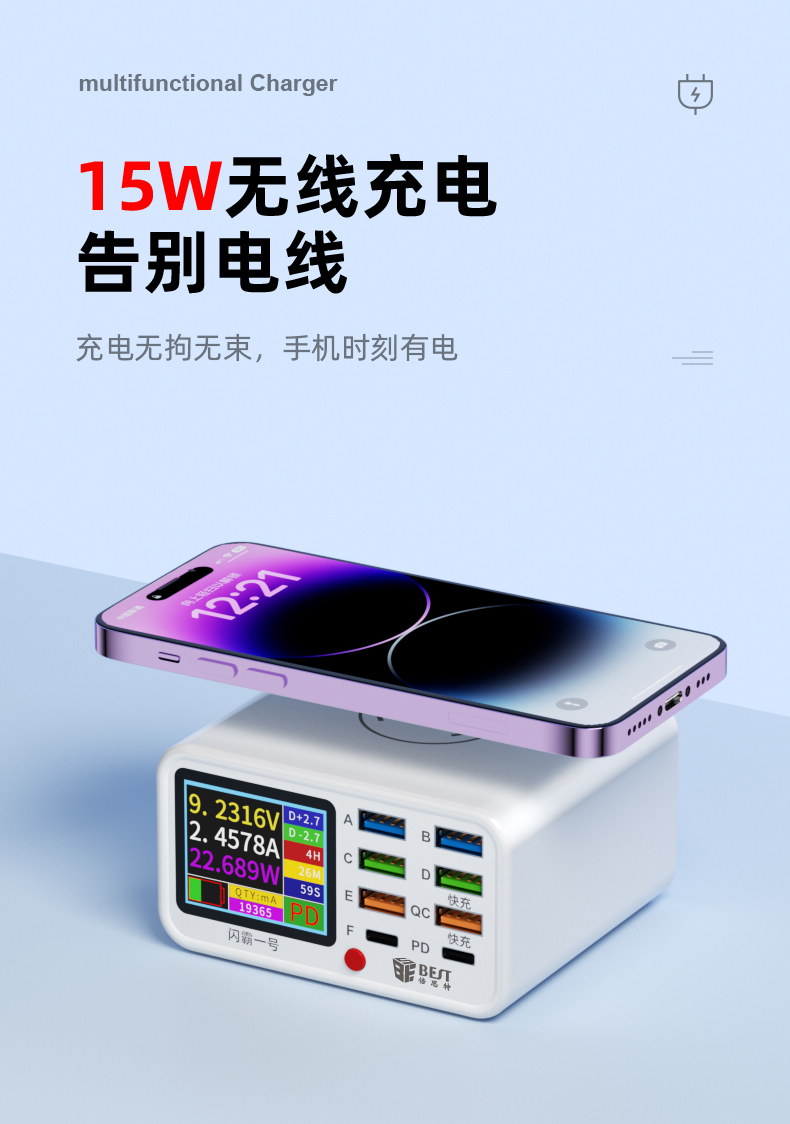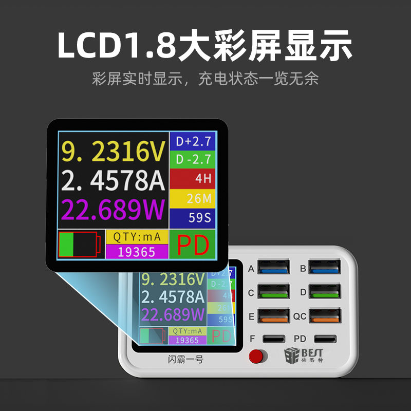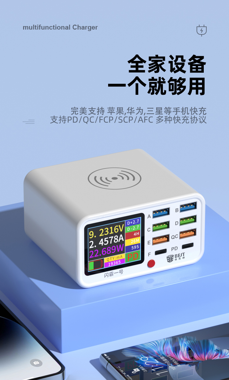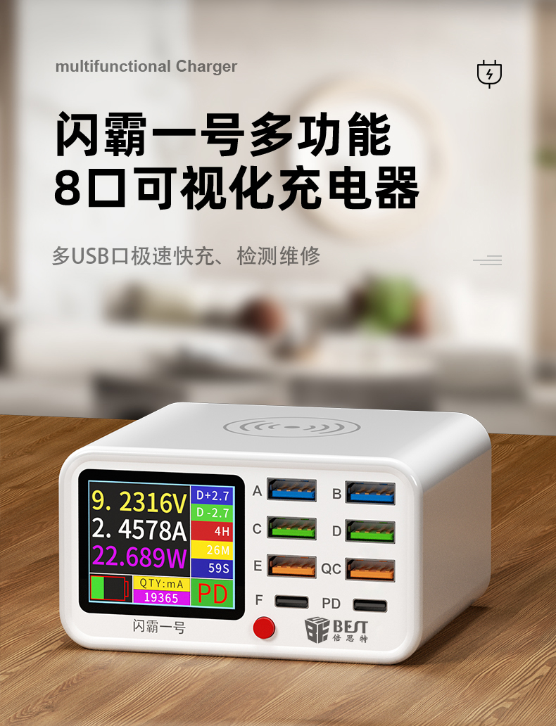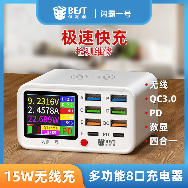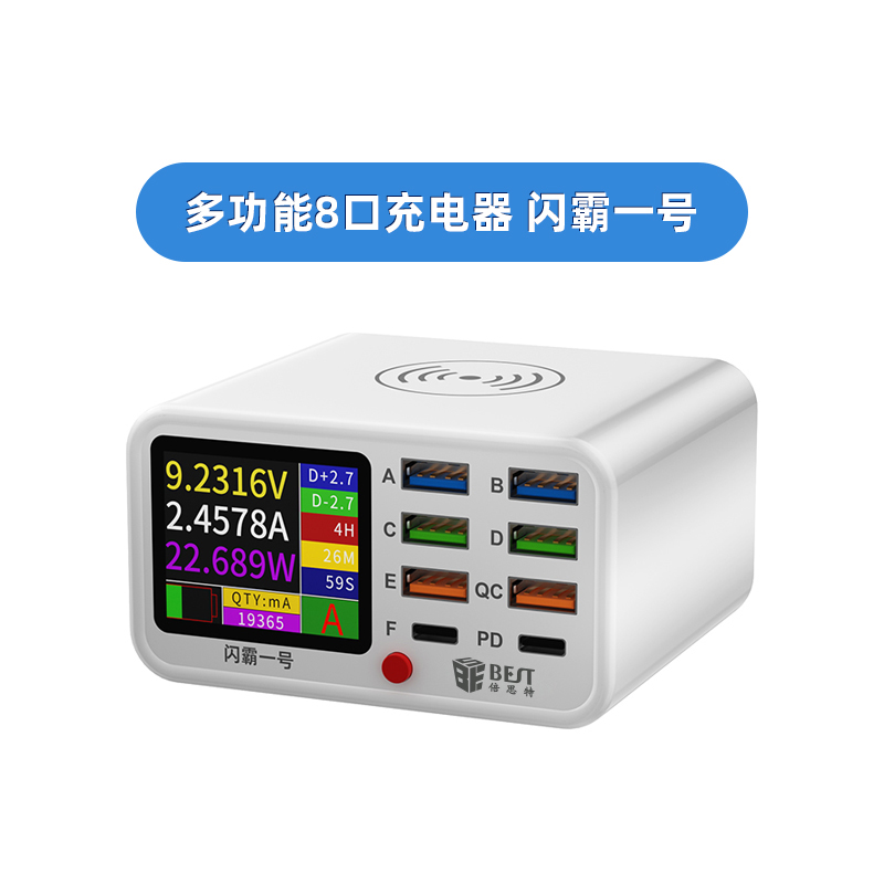 返回当前位置: 首页 / 产品中心 / BST-S1 闪霸一号 多功能8口可视化USB充电器 极速快充 无线快充 检测维修一体数显充电器