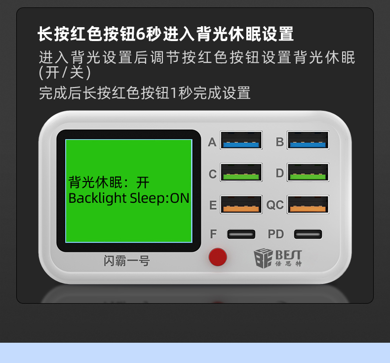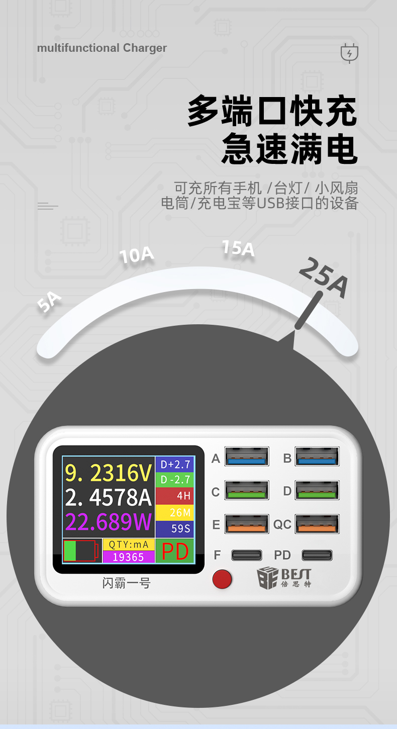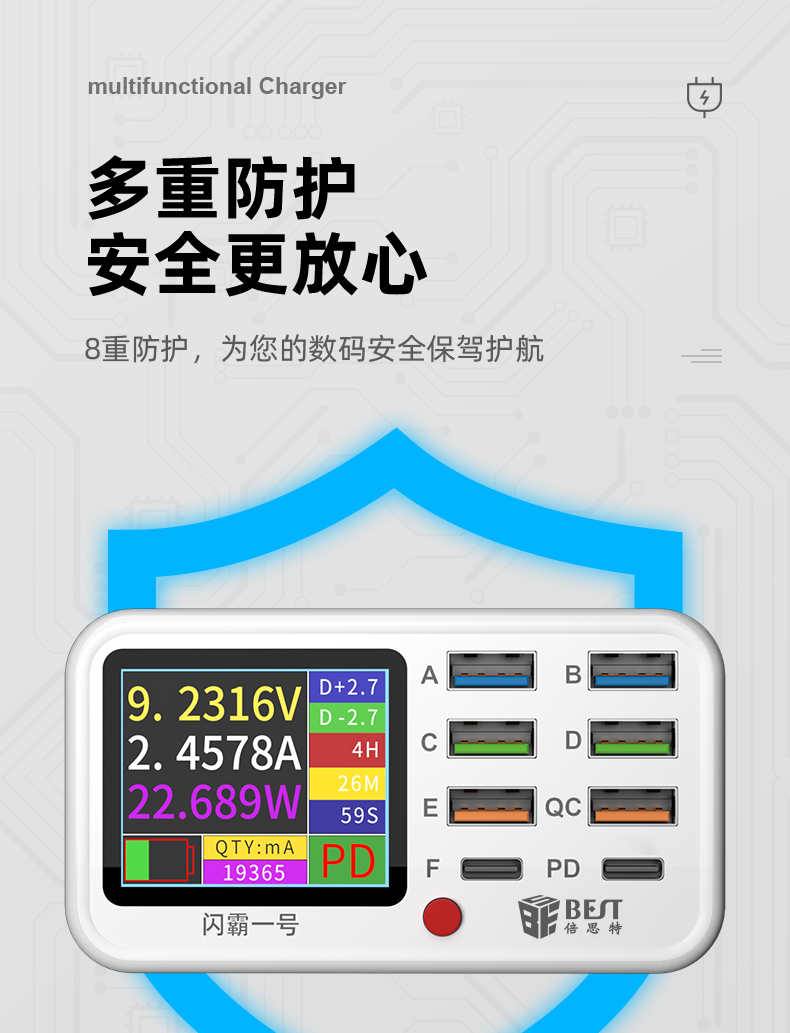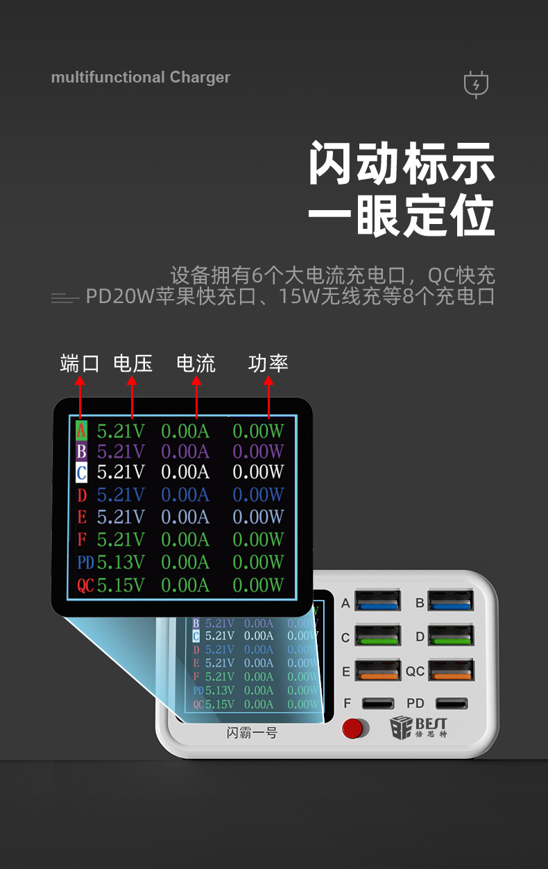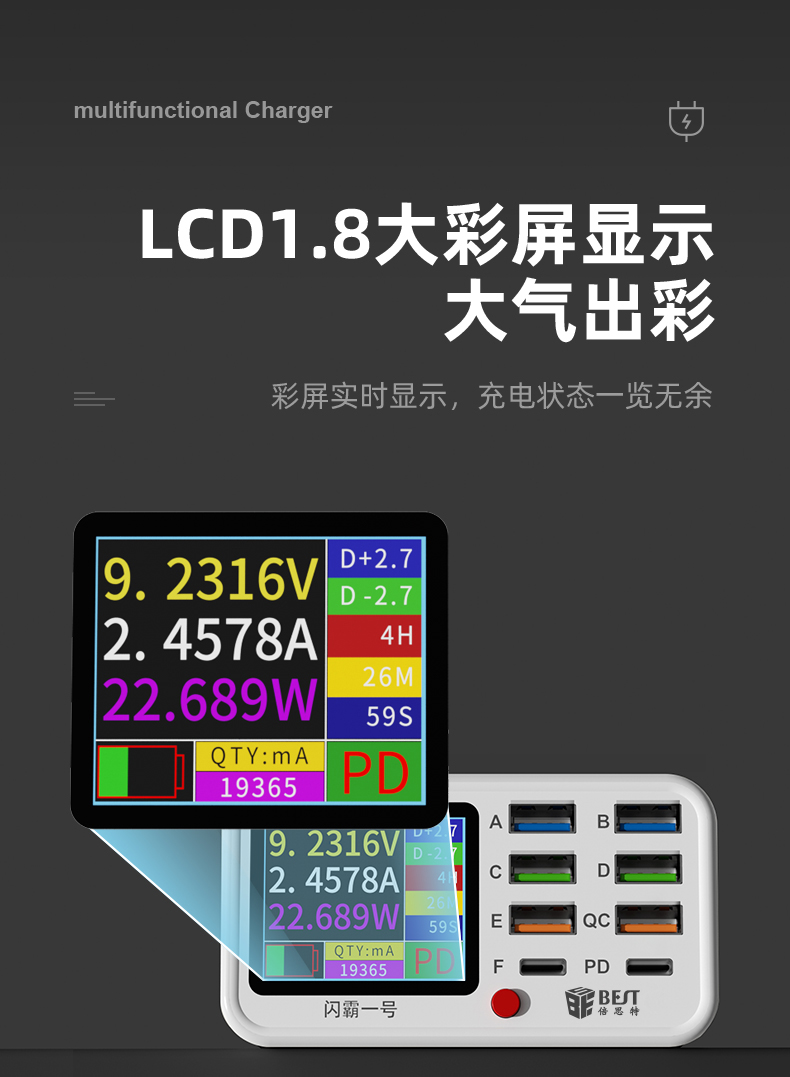 返回当前位置: 首页 / 产品中心 / BST-S1 闪霸一号 多功能8口可视化USB充电器 极速快充 无线快充 检测维修一体数显充电器