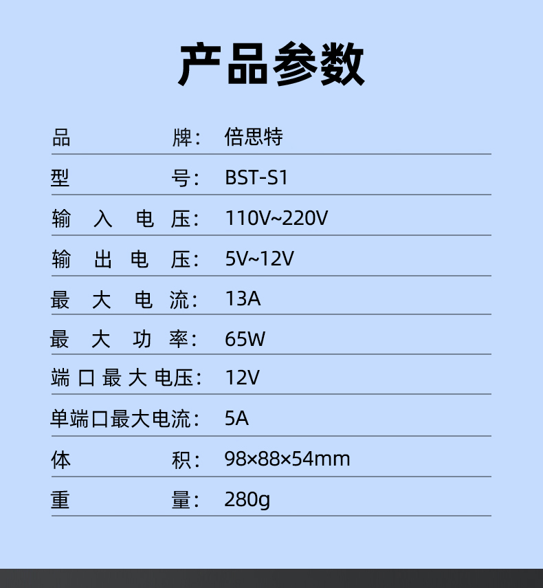 ? 产品名称: 闪霸一号? 产品型号: BST-S1? 产品类别: 充电适配器系列